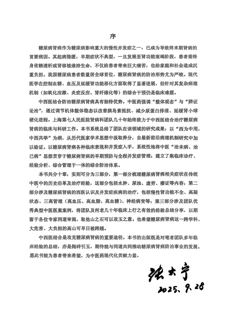 作为中医肾病领域的泰斗,张大宁先生的学术序言无疑为这部著作增添了厚重的分量。在序言中,张大师对专著给予了高度评价,称其“体系完备,见解独到,融汇古今而不泥古,博采中西而能贯通”。他特别指出,该书的出版恰逢其时,对于推动糖尿病肾病的中西医结合诊疗规范化、系统化具有重要意义,并欣然寄语,期望本书能成为启迪临床医生思路、惠及广大患者的佳作。